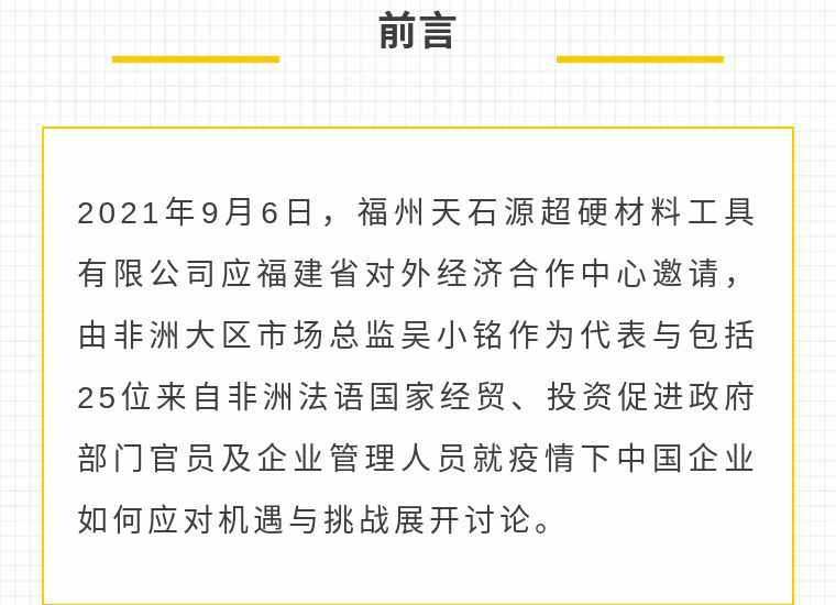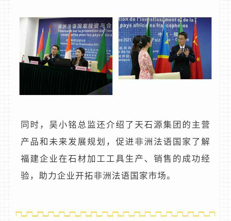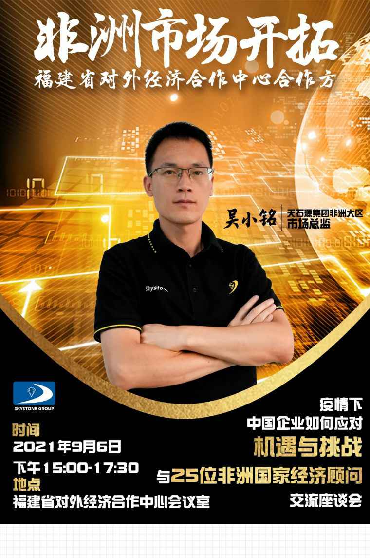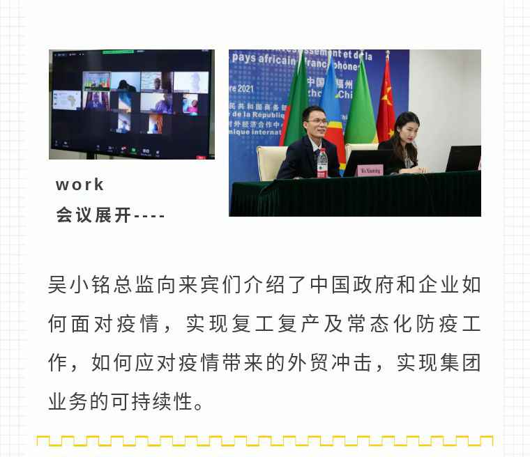 2021年9月6日,九州体育app登录入口(中国)官方网站应福建省对外经济合作中心邀请,由非洲大区市场总监吴小铭作为代表与包括25位来自非洲法语国家经贸、投资促进政府部门官员及企业管理人员就疫情下中国企业如何应对机遇与挑战展开讨论。